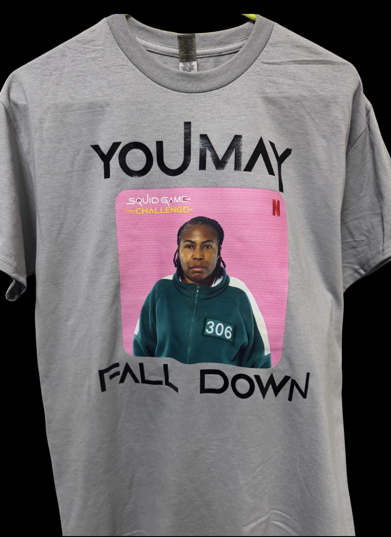 Show your resilience with this bold unisex tee inspired by my participation in Squid Game The Challenge as l “Player 306” print, front message “You May Fall Down”, back message “Just Don’t Ever Stay Down”; perfect gift for fans of high-stakes drama and motivational streetwear.