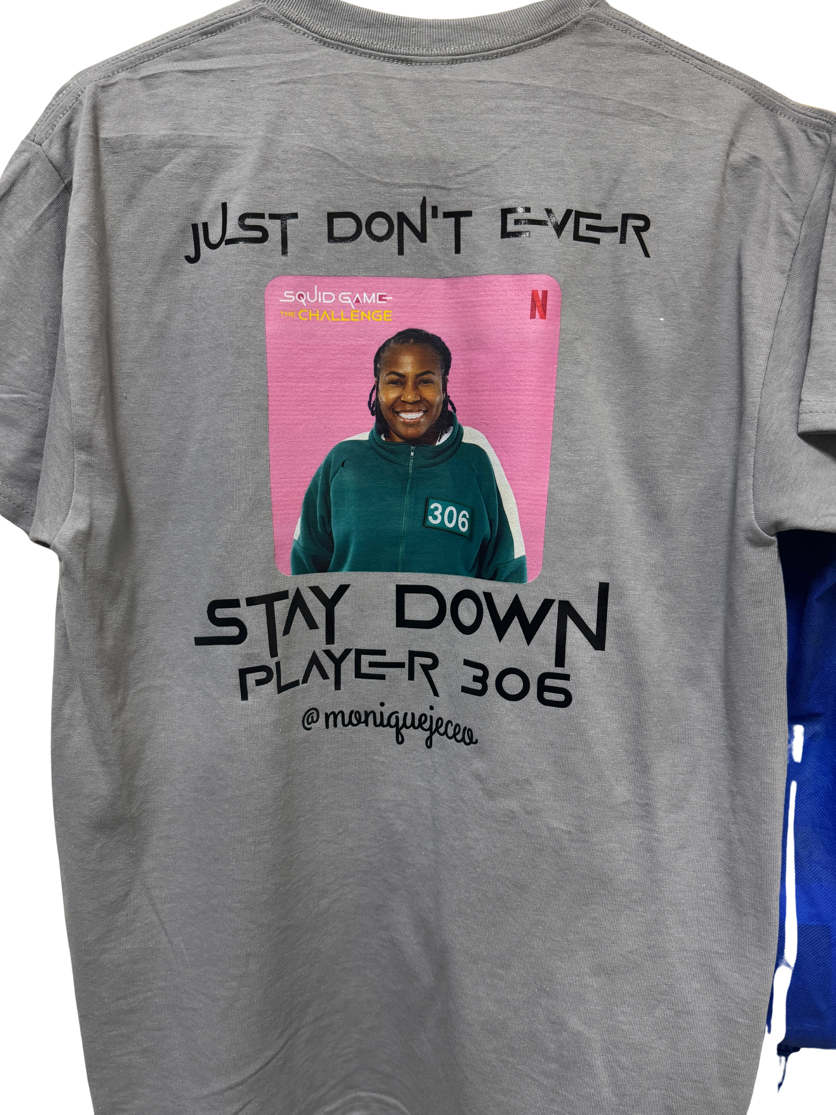 Show your resilience with this bold unisex tee inspired by my participation in survival-game Squid Game “The Challenge” as “Player 306” front message “You May Fall Down”, back message “Just Don’t Ever Stay Down”; perfect gift for fans of high-stakes drama and motivational streetwear.